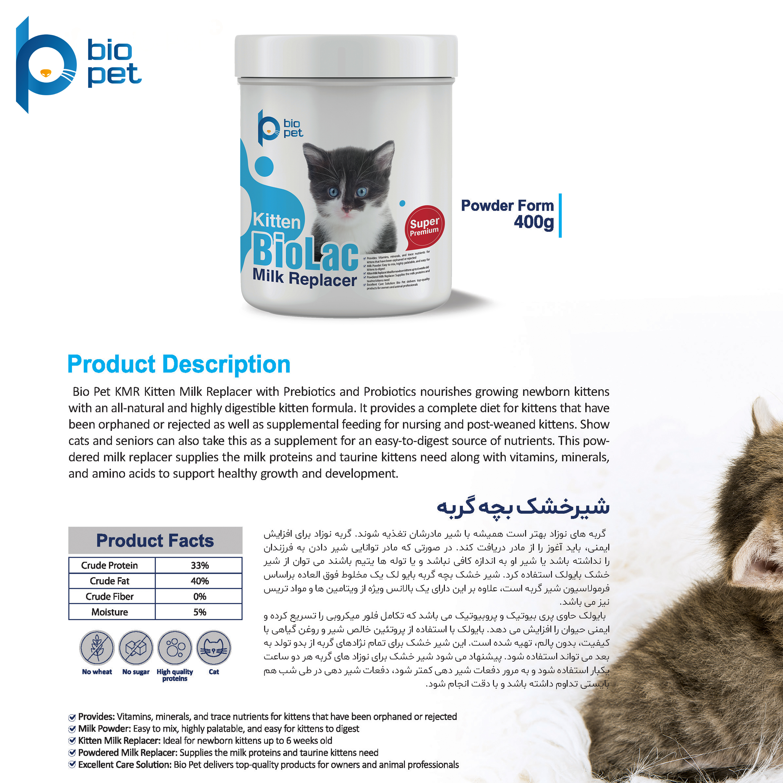 شیرخشک سگ سوپر پرمیوم بایولک از برند بایوپت، فقط یک شیرخشک نیست بلکه حاوی کازئین، پودرخامه، شیرخشک بدون لاکتوز، اسیدآمینههای ضروری، مینرالها، تریس المنتها و ویتامینهای A, D3, K, E, C, B1, B2, B6, B7 است که کیفیت بسیار بالایی دارد و درصد چربی و پروتئین آن نسبت به سایر شیر خشکها بسیار بالاتر است، شیر خشک بچهسگ بایو لک یک مخلوط فوقالعاده براساس فرمولاسیون شیر سگ است علاوه بر این دارای یک بالانس ویژه از ویتامینها و مواد تریس نیز میباشد. شیرخشک بچهگربه بایو لک یک مخلوط فوقالعاده براساس فرمولاسیون شیر گربه است علاوه بر این دارای یک بالانس ویژه از ویتامینها و مواد تریس نیز میباشد. بایو لک با استفاده از پروتئین خالص شیر و روغن گیاهی باکیفیت، بدون پالم، با گرید انسانی تهیه شده است و حاوی پریبیوتیک و پروبیوتیک اختصاصی نیز میباشد که تکامل فلور میکروبی را تسریع کرده و ایمنی حیوان را افزایش میدهد. این شیرخشک میتواند براى تمام نژادهاى گربه از بدو تولد به بعد استفاده شود. پیشنهاد مىشود شیرخشک برای نوزادهای گربه هر دو ساعت یکبار استفاده و به مرور دفعات شیردهى کمتر شود، دفعات شیردهى در طی شب هم بایستى تداوم داشته باشد و با دقت انجام شود. دقت شود که شیردهى بیش از حد انجام نشود تا منجر به نفخ نگردد، سعی شود فقط مقدار کمى در هر دفعه تغذیه شود و به جاى مقدار، دفعات را افزایش دهید. هر بار شیر باقیمانده را دور ریخته و در وعده بعدی شیر جدید درست کنید. به دماى شیر دقت کنید، دماى شیر باید با دماى بدن یکسان و جاى نگهدارى بچهگربهها حتما گرم باشد. براى آمادهسازى شیرخشک لازم است هر حجم از پودر شیرخشک را با دو حجم آب مخلوط کنید. دقت کنید مراحل آمادهسازى شیرخشک براى بچهگربه را مطابق دستور العمل داخل قوطى رعایت کنید. شیر دادن به بچهگربه حتما مطابق تصویر در بروشور محصول باشد. بعد از خوراندن شیر حتما شکم بچهگربه را با یک پارچه نرم و گرم براى چند دقیقه ماساژ دهید. بایو لک را در دورانهاى بعدى زندگى حیوان به عنوان یک میان وعده مغذى میتوانید استفاده کنید. مصرف این شیرخشک براى تمام گربههاى شیرده نیز پیشنهاد میشود.