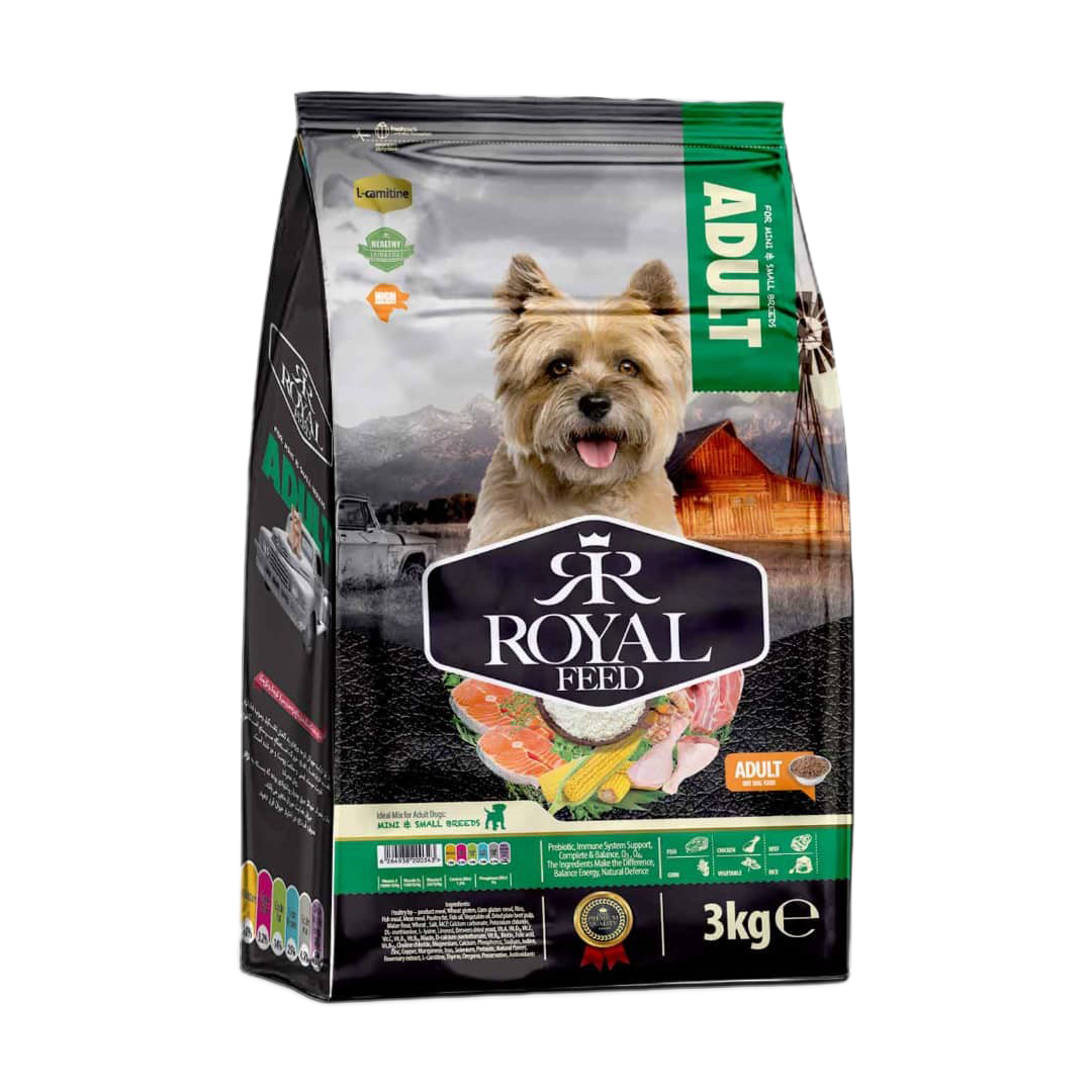 غذای خشک سگ بالغ رویال فید مخصوص سگ های نژاد کوچک و بسیار کوچک حاوی پودر گوشت طیور، گلوتن ذرت، گلوتن گندم، برنج، ذرت گندم، آرد گندم، پودر ماهی، چربی طیور، روغن ماهی، روغن گیاهی، پودر گوشت دامی، لیزین، مکمل ویتامینه و معدنی، پری بیوتیک، ال-کارنیتین و آنتی اکسیدان می باشد. این محصول مجوزهای لازم از سازمان دامپزشکی را دارد.