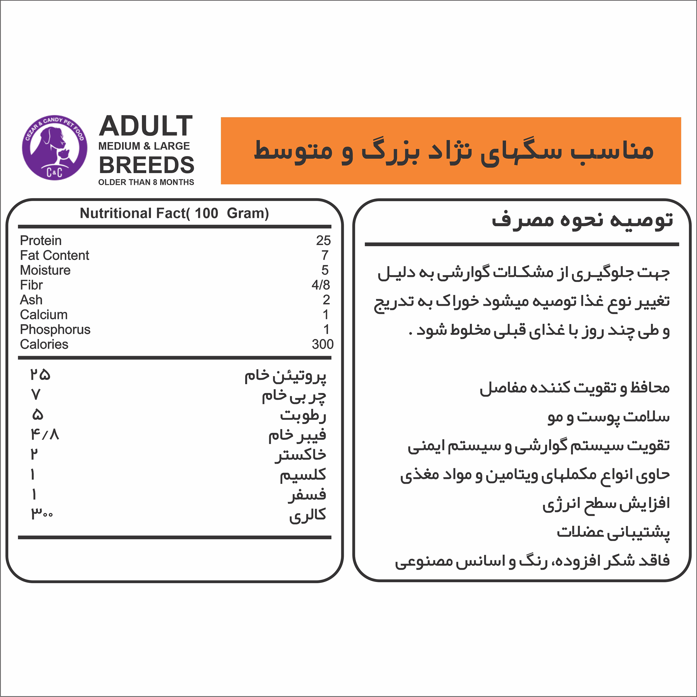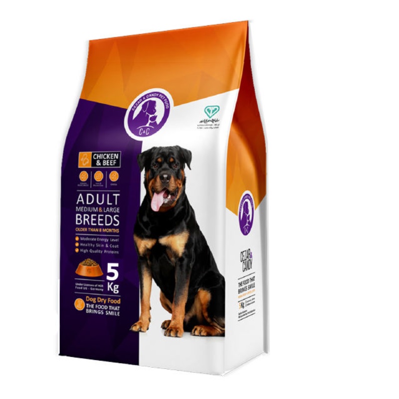 غذای خشک سگ بالغ نژاد متوسط و بزرگ سزار اند کندی (C&C)، این غذا مناسب سگ های بالغ نژاد متوسط و بزرگ می باشد که سن آن ها بالای هشت ماه است. میزان پروتئین این محصول بر پایه گوشت مرغ و گوشت قرمز 25 % لحاظ شده است. که این میزان به خوبی احتیاجات یک سگ بالغ را برآورده می کند و باعث حفظ عضلات میشود.