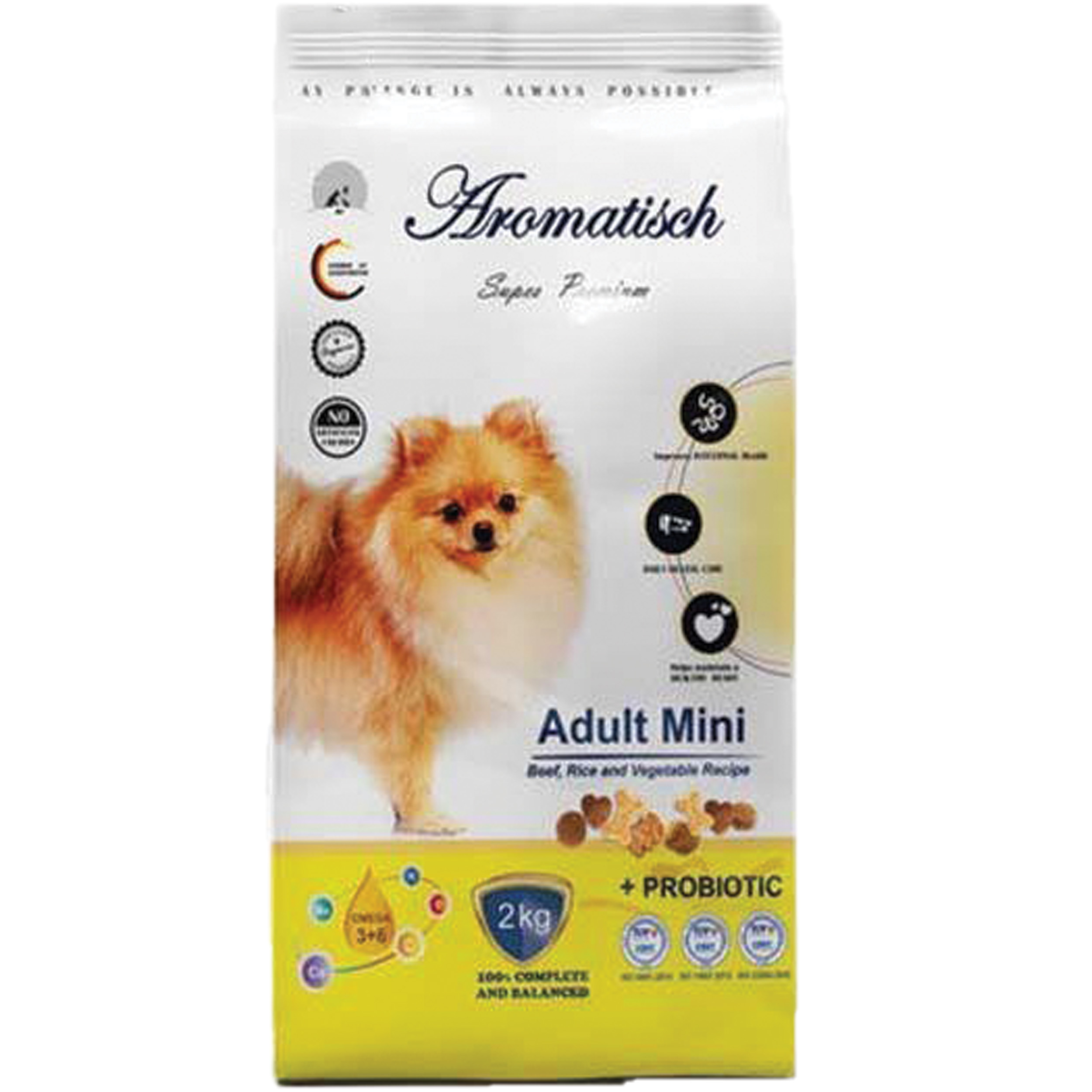 غذای سگ بالغ نژادکوچک و متوسط آروماتیش در دو طعم گوشت و گوشت مرغ می باشد. سگ های نژاد کوچک معده کوچکتری دارند ، به همین دلیل آنها به غذای باکیفیت و غنی از مواد مغذی نیاز دارند. این غذا دارای مواد مغذی غنی از پروتئینهای ضروری، کربوهیدراتها، اسیدهای چرب امگا 3 و امگا 6 و موارد دیگر باشند. این غذای سوپر پرمیوم در شرکت آروماتیش (تحت لیسانس آلمان) در ایران تولید شده است.