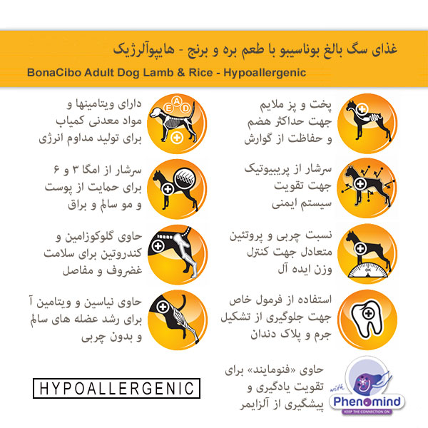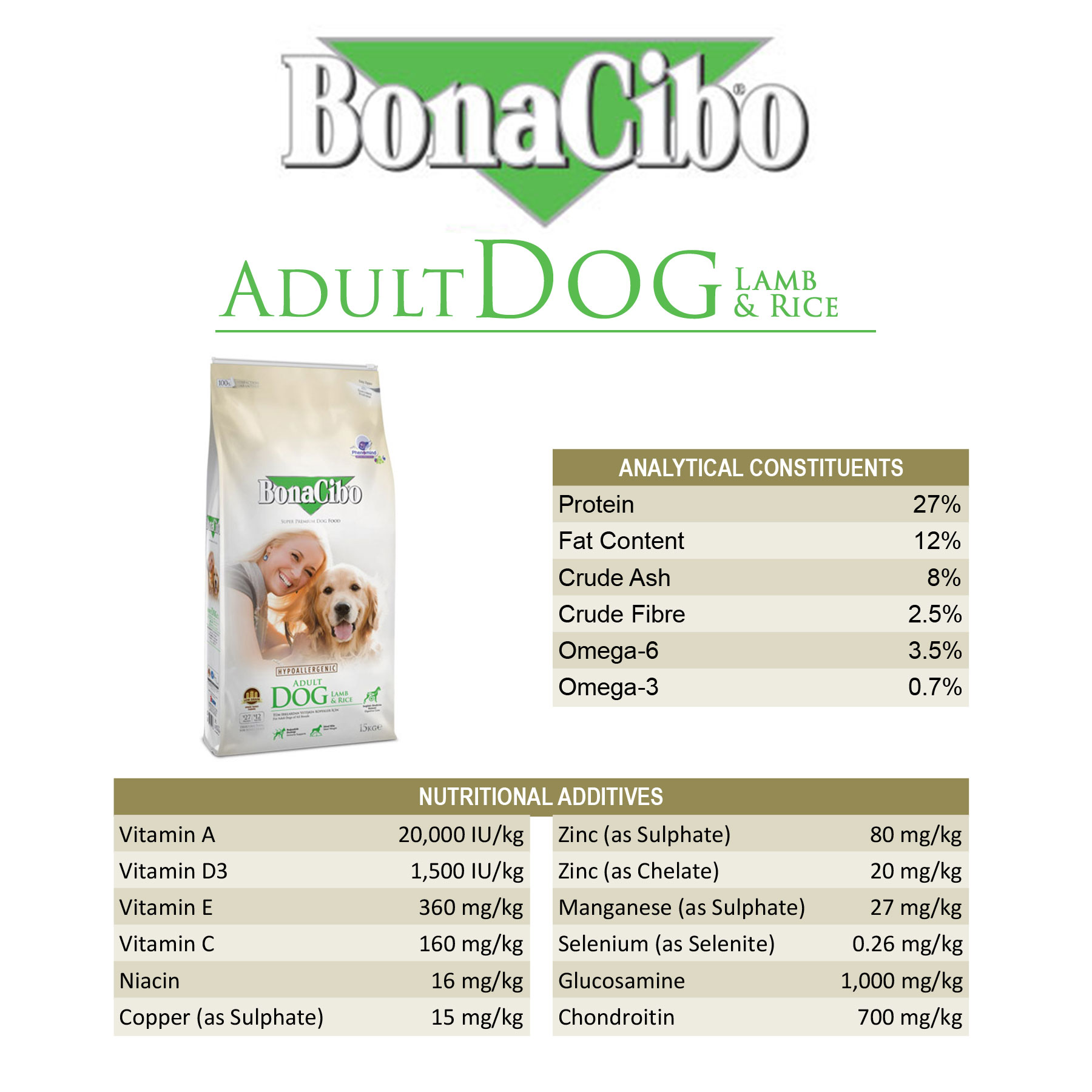 غذای سگ بالغ بوناسیبو با طعم بره و برنج برای سگ های بد غذا با هضم حساس به گونه ای طراحی شده است که تمام نیازهای روزانه سگ را تامین کند. درصد متعادل و بالانس شده از پروتئین، چربی ها و کربوهیدارت ها باعث می شود که حیوان وزن ایده آل و مناسبی داشته باشد.
