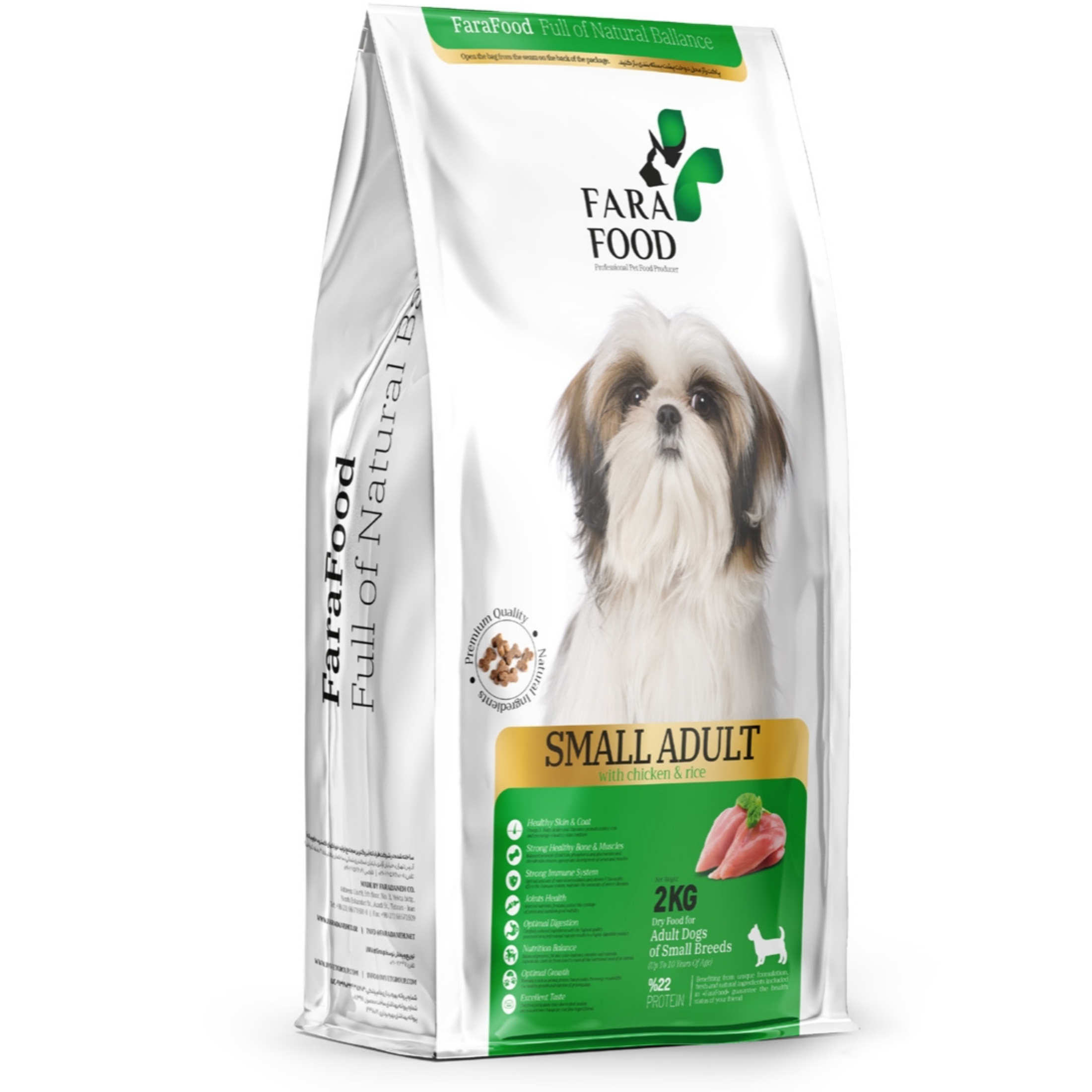 غذای خشک مخصوص سگ های بالغ نژاد کوچک فرافود با تکهها ریز 13 میلیمتری شامل ترکیبات مقوی و لازم زیر است: