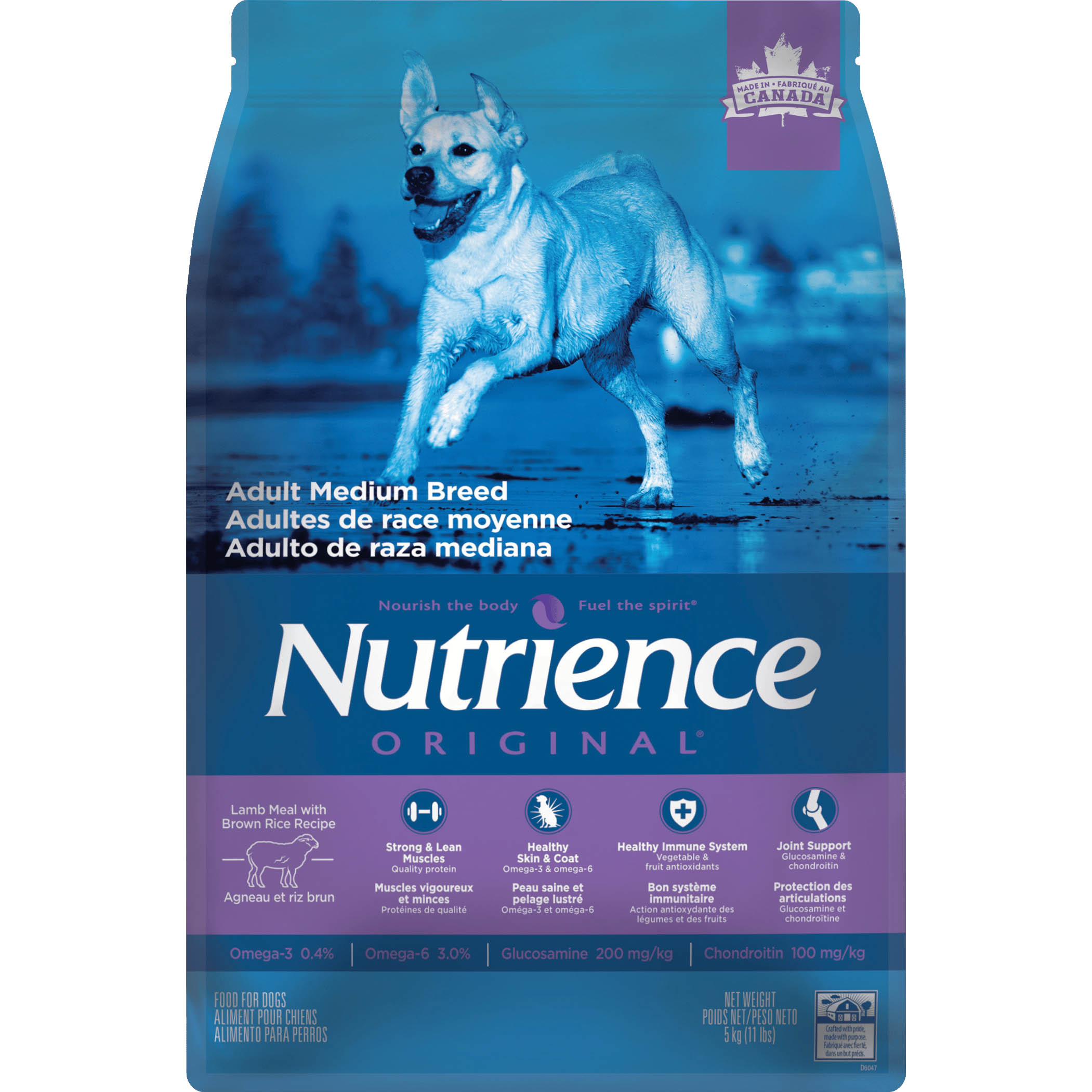 گوشت بره به عنوان ماده اصلی در غذای سگ نژاد متوسط بزرگسالان Nutrience از بدن قوی و فعال سگ شما به شکل یک غذای خوشمزه پشتیبانی می کند. این غذا دارای ترکیبات زیر می باشد: گوشت بره، جو، بلغور جو دوسر، نخود فرنگی، برنج قهوه ای، پودر مرغ، چربی مرغ (حفظ شده با توکوفرول های مخلوط)، تفاله چغندر خشک، طعم طبیعی بره، بذر کتان، مخمر آبجو، روغن ماهی قزل آلا (منبع DHA)، زغال اخته، زغال اخته، هویج ویتامین ها [مکمل ویتامین E، مکمل ویتامین A، نیاسین، پانتوتنات کلسیم، ریبوفلاوین، پیریدوکسین هیدروکلراید، تیامین مونونیترات، بیوتین، مکمل ویتامین B12، مکمل ویتامین D3، اسید فولیک]، مواد معدنی [سولفات روی، پروتئین روی، پروتئین آهن، فروس سولفات، پروتئینات مس، سولفات مس، پروتئینات منگنز، اکسید منگنز، یدات کلسیم، سلنیت سدیم]، کلرید پتاسیم، نمک، DL-متیونین، L-لیزین، لسیتین، کلرید کولین، عصاره مخمر، عصاره ریشه کاسنی، هیدروکلوریتین، گلوکور سولفات، عصاره رزماری. این محصول تولید کانادا می باشد.