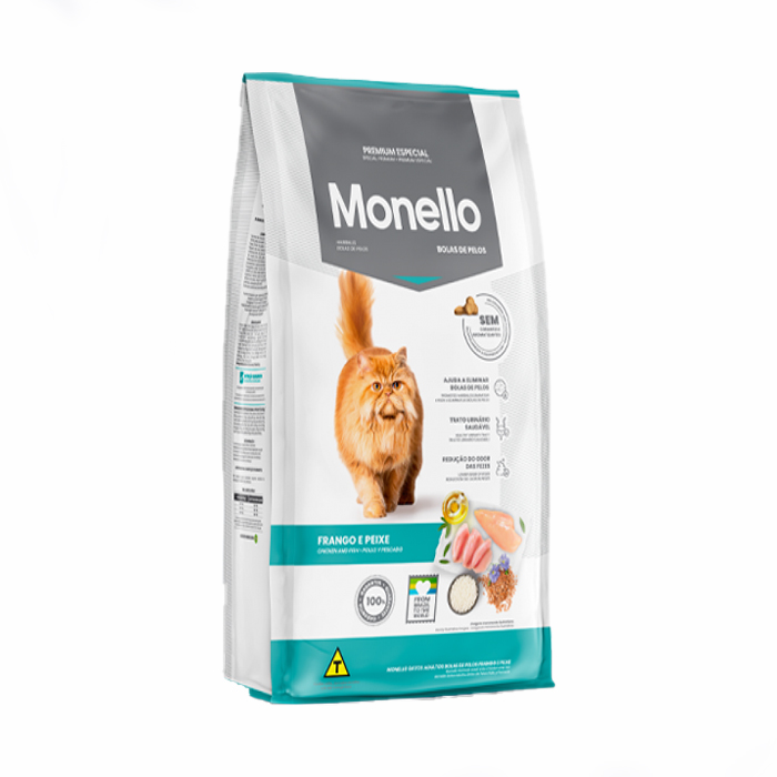ویژگیهای این نوع غذا شامل حذف موهای گلوله شده در روده، جلوگیری از استفراغ کردن گربه، جلوگیری از گیر کردن مو در روده، کمک به عملکرد روده، حفظ وزنی ایدهآل، کاهش حجم و بوی نامطبوع مدفوع، کمک به سلامت دستگاه ادراری، جلوگیری از سنگ مثانه و کمک به رشدی ایدهآل است. آنالیز غذا خشک مونلو شامل پروتئبن خام 34٪، چربی خام 8.5٪، فیبر خام 4.5٪، خاکستر 8.5٪، کلسیم 1.6-0.8٪، فسفر 1.6-0.8٪، سدیم 25٪، منیزیم 0.1-0.07٪، امگا3 0.2٪، امگا6 1٪ و رطوبت 10٪ است.