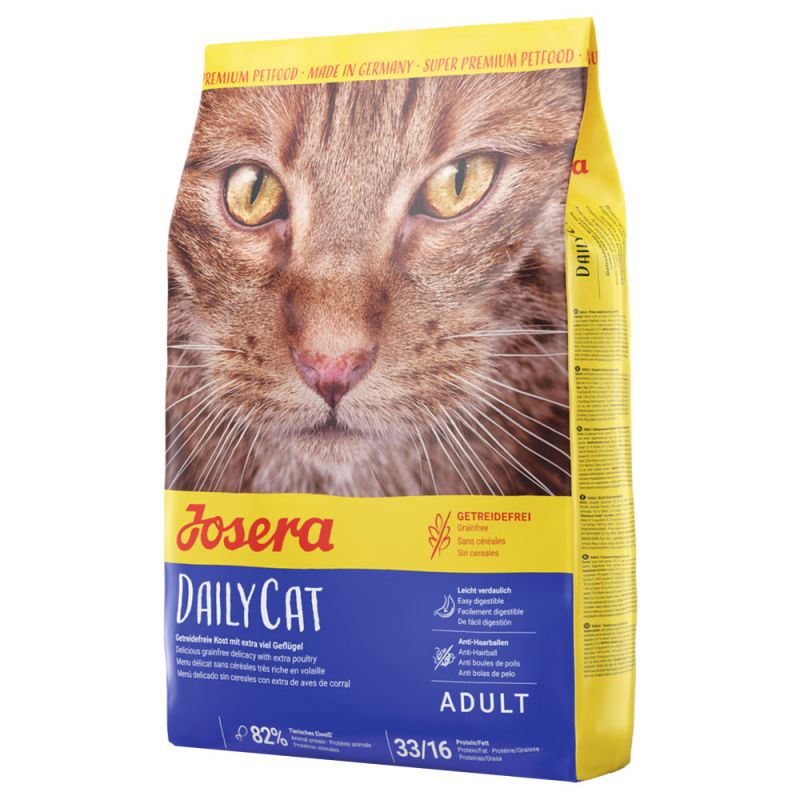 غذای خشک دیلی کت سوپر پریمیوم جوسرا بدون غلات و آنتی هربال (قابلیت دفع گلوله های مو) حاوی گوشت پرندگان و گیاهان طبی مانند ریشه کاسنی، نعنا فلفلی، تمشک، جعفری، بابونه، شیرین بیان ، دانه شنبلیله و رازیانه است .