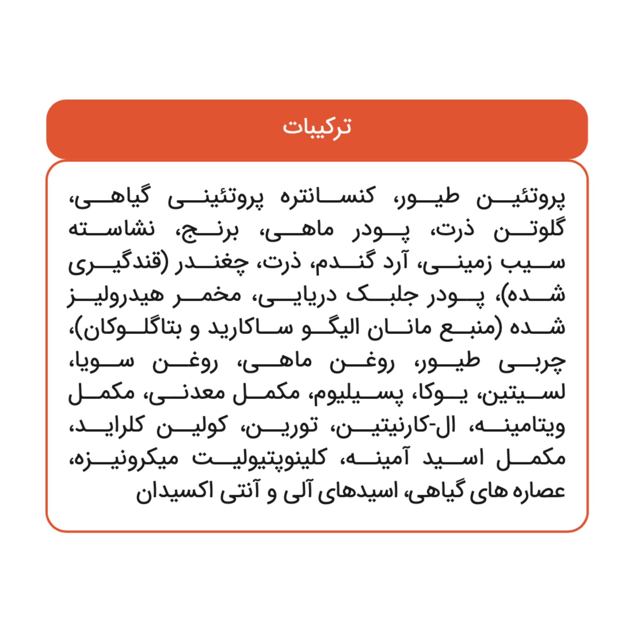 پروتئیــن طیــور، کنســانتره پروتئینــی گیاهــی، گلوتــن ذرت، پــودر ماهــی، برنــج، نشاســته ســیب زمینــی، آرد گنــدم، ذرت، چغنــدر (قندگیــری شــده)، پــودر جلبــک دریایــی، مخمــر هیدرولیــز شــده (منبــع مانــان الیگــو ســاکارید و بتاگلــوکان)، چربــی طیــور، روغــن ماهــی، روغــن ســویا، لســیتین، یــوکا، پســیلیوم، مکمــل معدنــی، مکمــل ویتامینــه، ال-کارنیتیــن، توریــن، کولیــن کلرایــد، مکمــل اســید آمینــه، کلینوپتیولیــت میکرونیــزه، عصاره های گیاهی، اسیدهای آلی و آنتی اکسیدان.