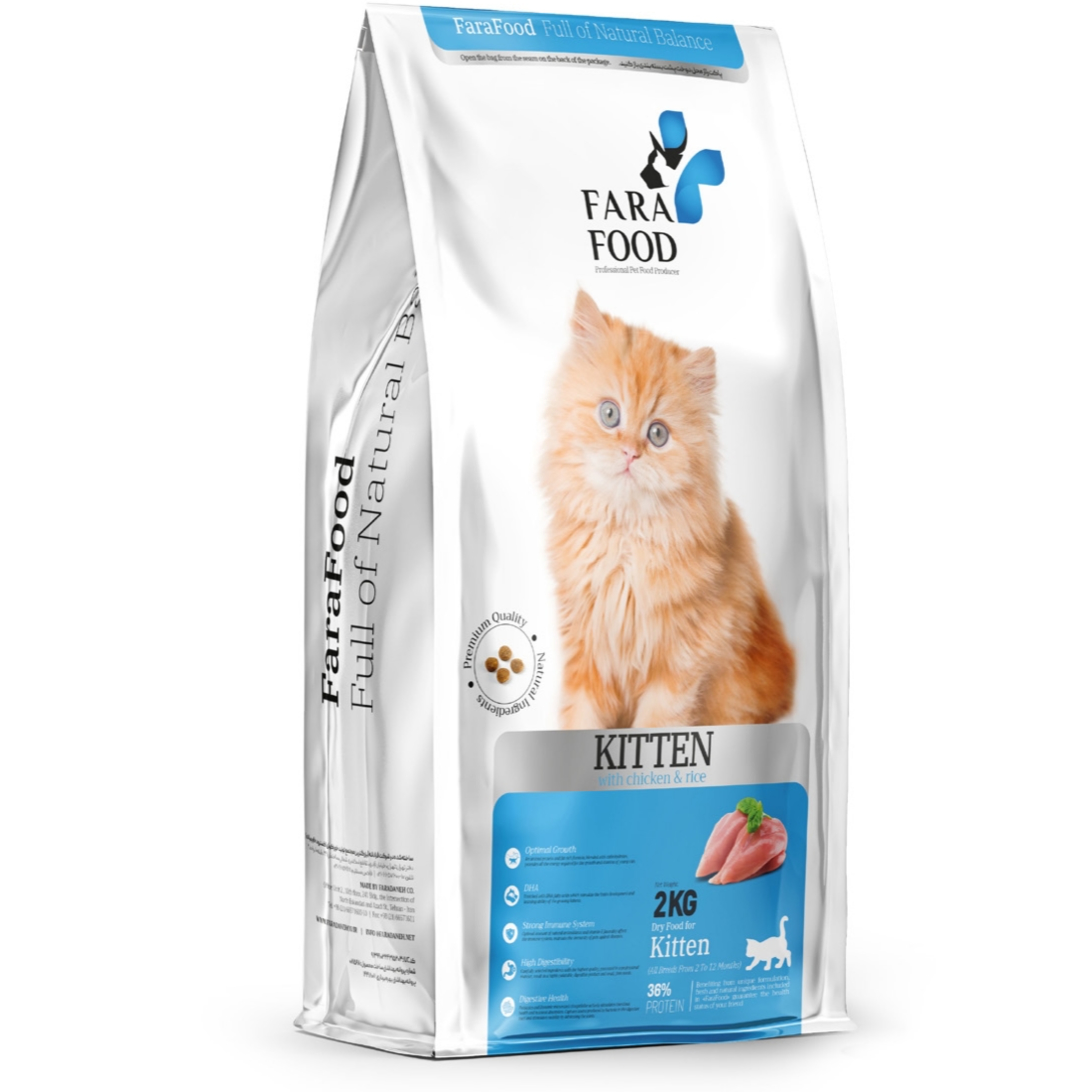 غذای خشک گربه کیتن (بچه گربه) فرافود مناسب برای تمام نژادها تا سن 12 ماهگی با تکهها ریز 7.5 میلیمتری شامل ترکیبات مقوی و لازم زیر است: