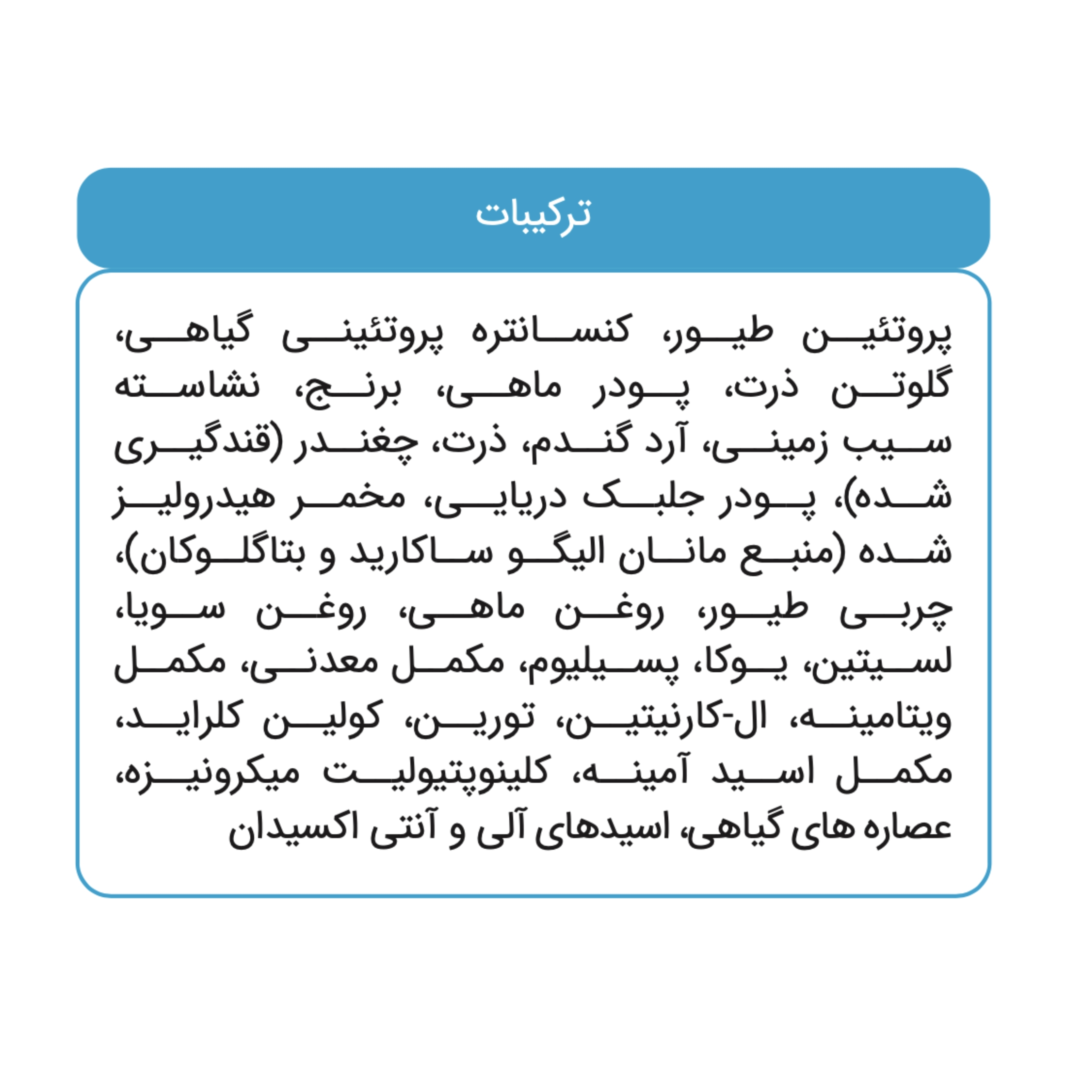 پروتئیــن طیــور، کنســانتره پروتئینــی گیاهــی، گلوتــن ذرت، پــودر ماهــی، برنــج، نشاســته ســیب زمینــی، آرد گنــدم، ذرت، چغنــدر (قندگیــری شــده)، پــودر جلبــک دریایــی، مخمــر هیدرولیــز شــده (منبــع مانــان الیگــو ســاکارید و بتاگلــوکان)، چربــی طیــور، روغــن ماهــی، روغــن ســویا، لســیتین، یــوکا، پســیلیوم، مکمــل معدنــی، مکمــل ویتامینــه، ال-کارنیتیــن، توریــن، کولیــن کلرایــد، مکمــل اســید آمینــه، کلینوپتیولیــت میکرونیــزه، عصاره های گیاهی، اسیدهای آلی و آنتی اکسیدان