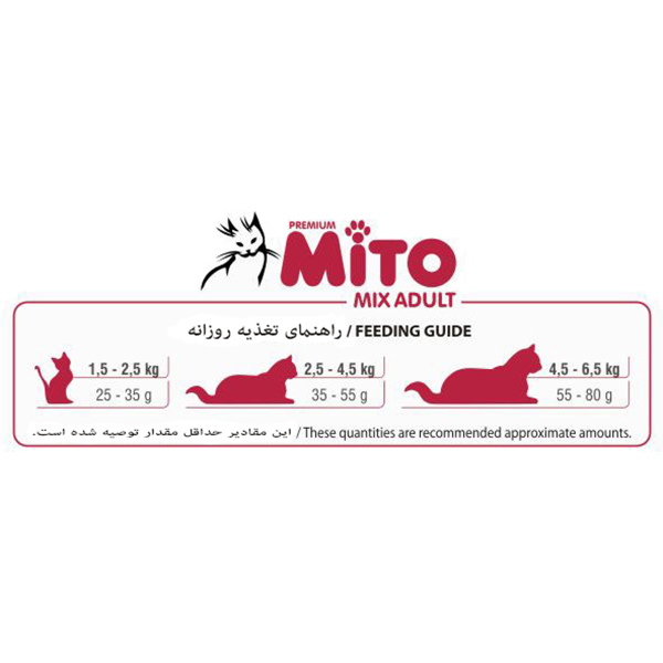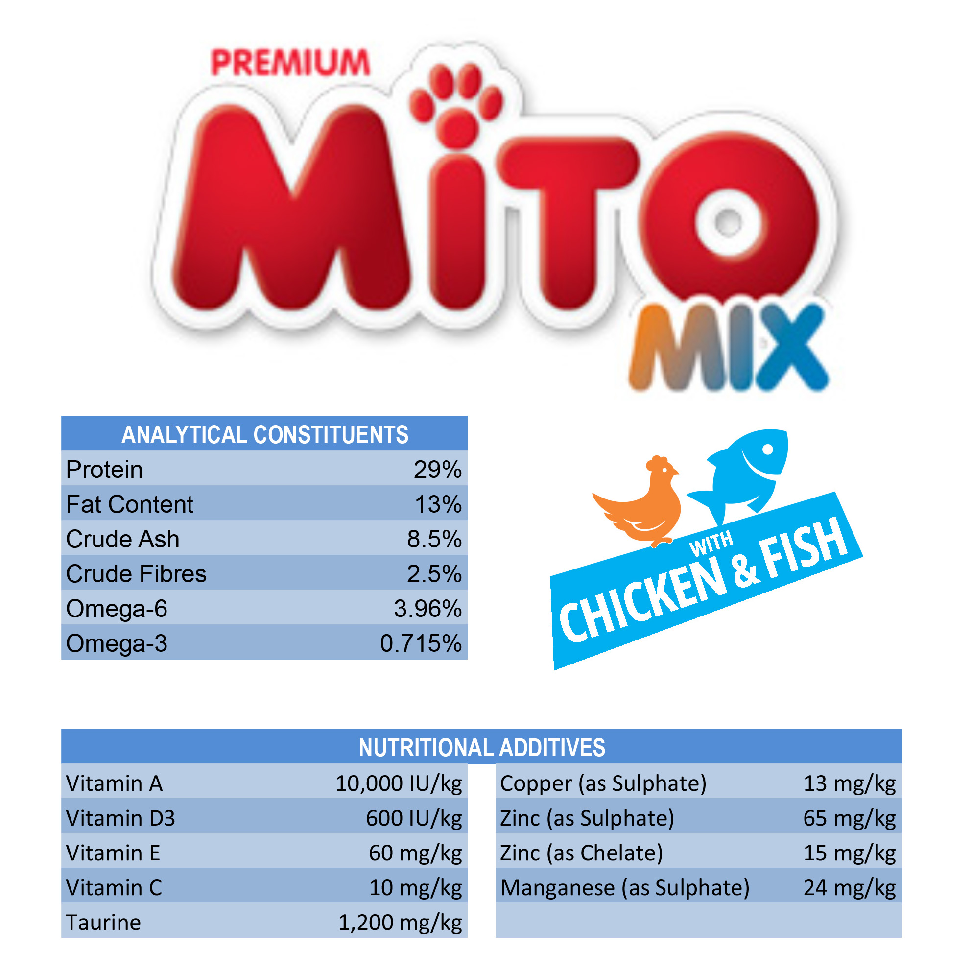 غذای پریمیوم میتومیکس با طعم مرغ وماهی مناسب تمامی نژادهای گربه های بالغ طوری فرآوری شده است که تمامی نژداهای گربه ها را در طول روز تامین میکند.