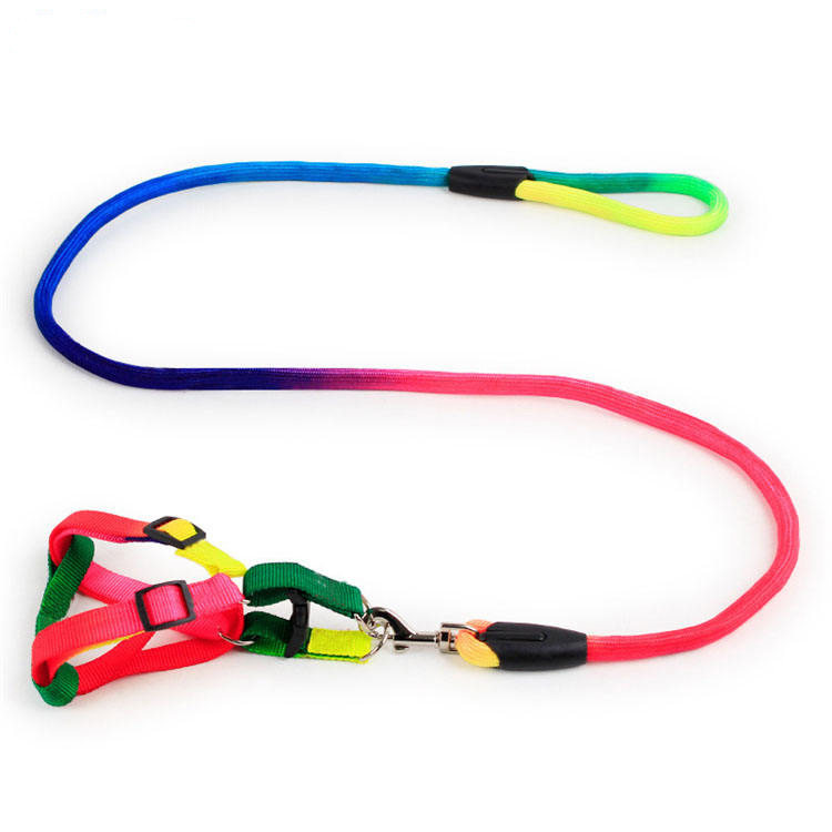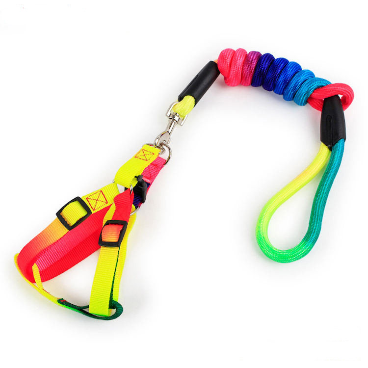 قلاده کتفی سگ و گربه به همراه بند قلاده رنگین کمانی سایز large مناسب برای سگ 9تا 18 کیلو بند قلاده به طول 120 سانتیمتر و قطر 25 میلیمتر می باشد قلاده کتفی تسمه ای با قابلیت تغییر اندازه از 30 الی 47 سانتیمتر است