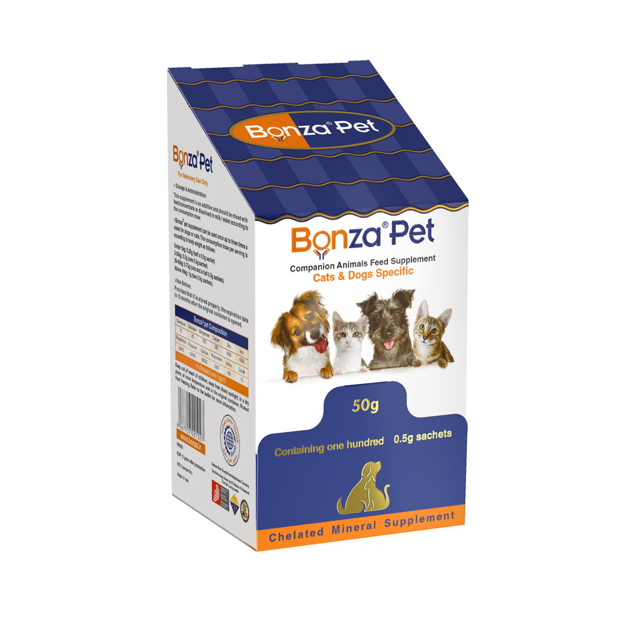 مکمل بنزا پت(Bonzapet) نسل جدید مکملهای حیوانات خانگی است. این مکمل، محتوی عناصر آهن-روی-مس-منگنز-کروم-ید-سلنیوم-کبالت- کلسیم-منیزیم-پتاسیم-فسفر میباشد که به صورت کلاته و با مقادیر تضمین شده در این محصول وجود دارد.