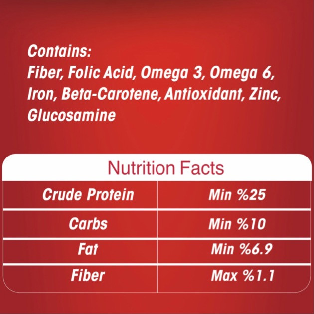 این کنسرو با توجه به داشتن پروتئین و فیبر لازم و مواد مغذی کاملا طبیعی برای تمامی سنین مناسب است . این محصول فاقد هرگونه افزودنیهای شیمیایی، مواد نگهدارنده، طعم دهندهها و رنگ دهندههای مصنوعی و پروتئینهای گیاهی می باشد. این کنسرو فاقد شکر، نمک و گلوتن میباشد و در آن از پر کنندهها (Filler) استفاده نشده است و به دلیل وجود افزودنیهای طبیعی (گلوکوزامین و زینک) باعث استحکام استخوان در تمامی سنین میشود. این ترکیبات با توجه به داشتن مقدار قابل ملاحظهای از امگا 3 و 6 به نگهداری سلامت پوست و مو و همچنین رشد مو کمک قابل توجهی مینماید. این وعده غذایی حاوی پروتئین، کربوهیدرات، مواد معدنی، فیبر و چربی، ترکیب مایعات و افزودنیهای طبیعی مغذی است.