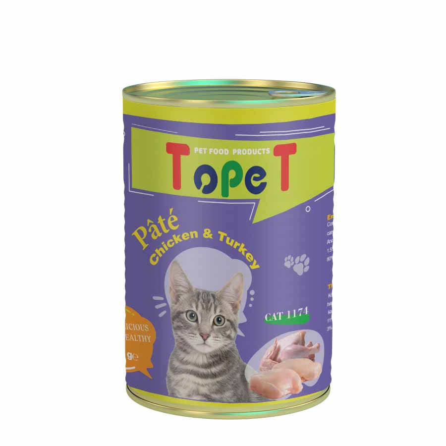 کنسرو پته گربه مدل مرغ و بوقلمون شامل ترکیب میکس بوقلمون ومرغ و آب گوشت و مواد افزودنی مجاز دیگر میباشد . دارای دو سال تاریخ انقضا از زمان تولید میباشد . پس از باز شدن در یخچال نگهداری شود