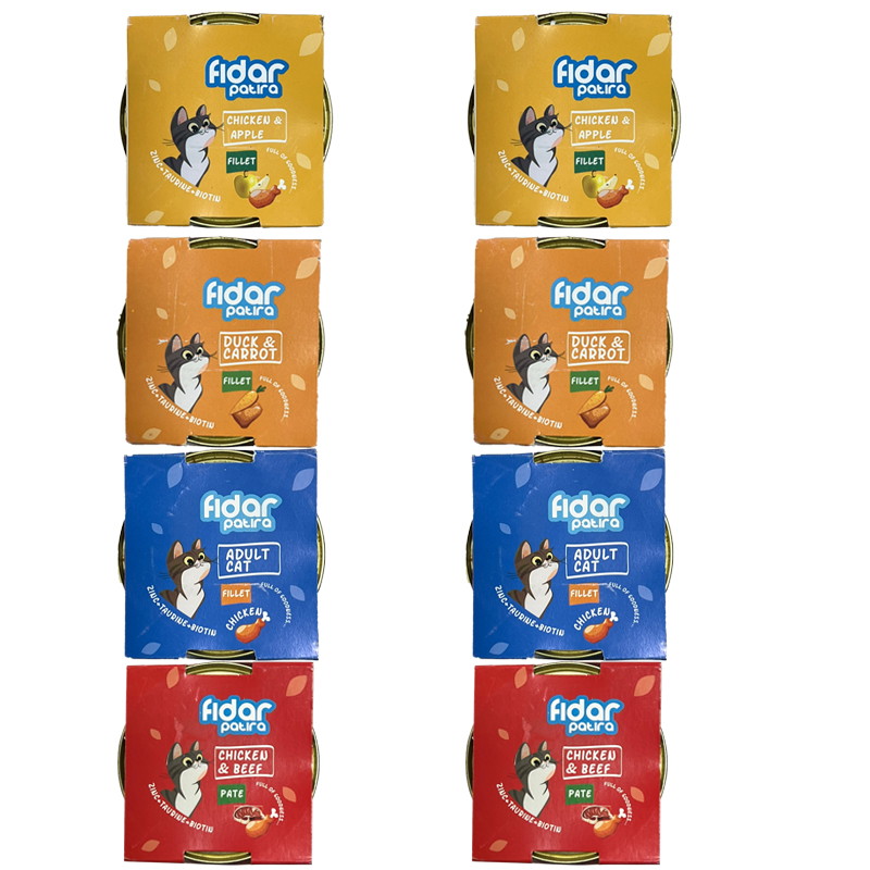 کنسرو گربه فیدار پاتیرا مدل Mix 01 وزن 120 گرم بسته 8 عددی حاوی 4 طعم کنسرو لذیذ و خوش خوراک مخصوص گربه بالغ می باشد. کنسرو گربه فیدار 100% طبیعی است و حاوی انواع ویتامین ها و مواد معدنی می باشد. این محصول حاوی طعم های گوشت و مرغ، فیله مرغ، اردک و هویج، مرغ و سیب می باشد.
